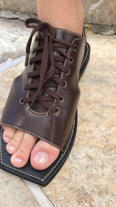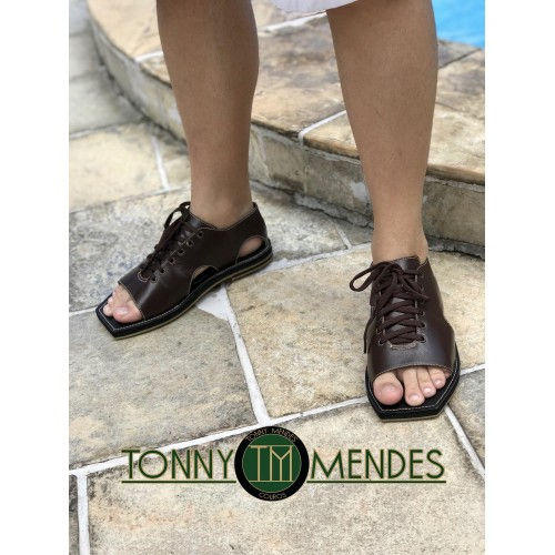 A Sandália artesanal possui material em couro legitimo, trazendo conforto para os usuários através de uma palmilha que possui ondulações em seu formato com objetivo de massagear os pés ao caminhar. Seu solado é composto de material em borracha (látex antiderrapante) que obtém estabilidade em diversos pisos.